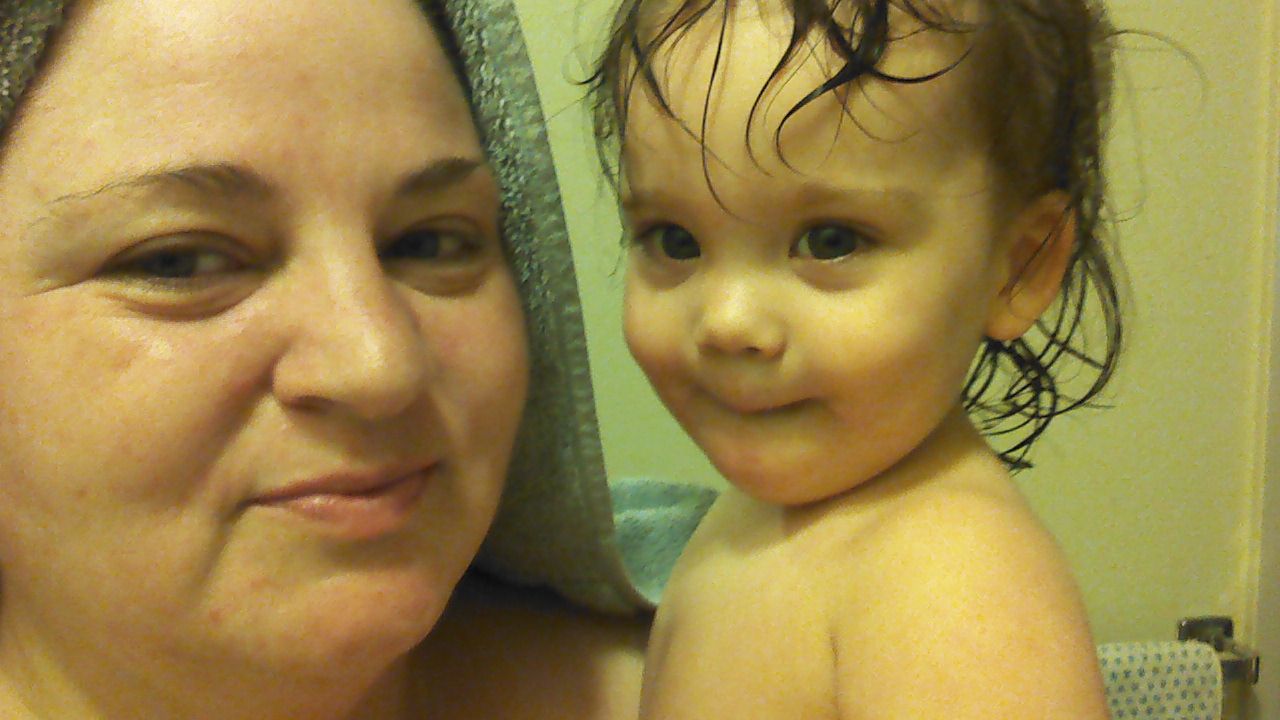 Darla climbed into the tub and tried (successfully) tp insert the drain stopper