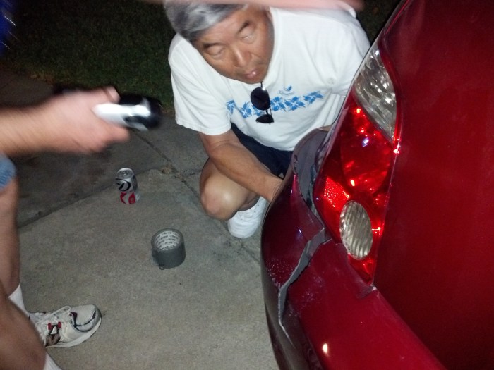 You fix it. Ric is looking at the bumper and thinking of ways to re attach it. Dad is holding the flashlight