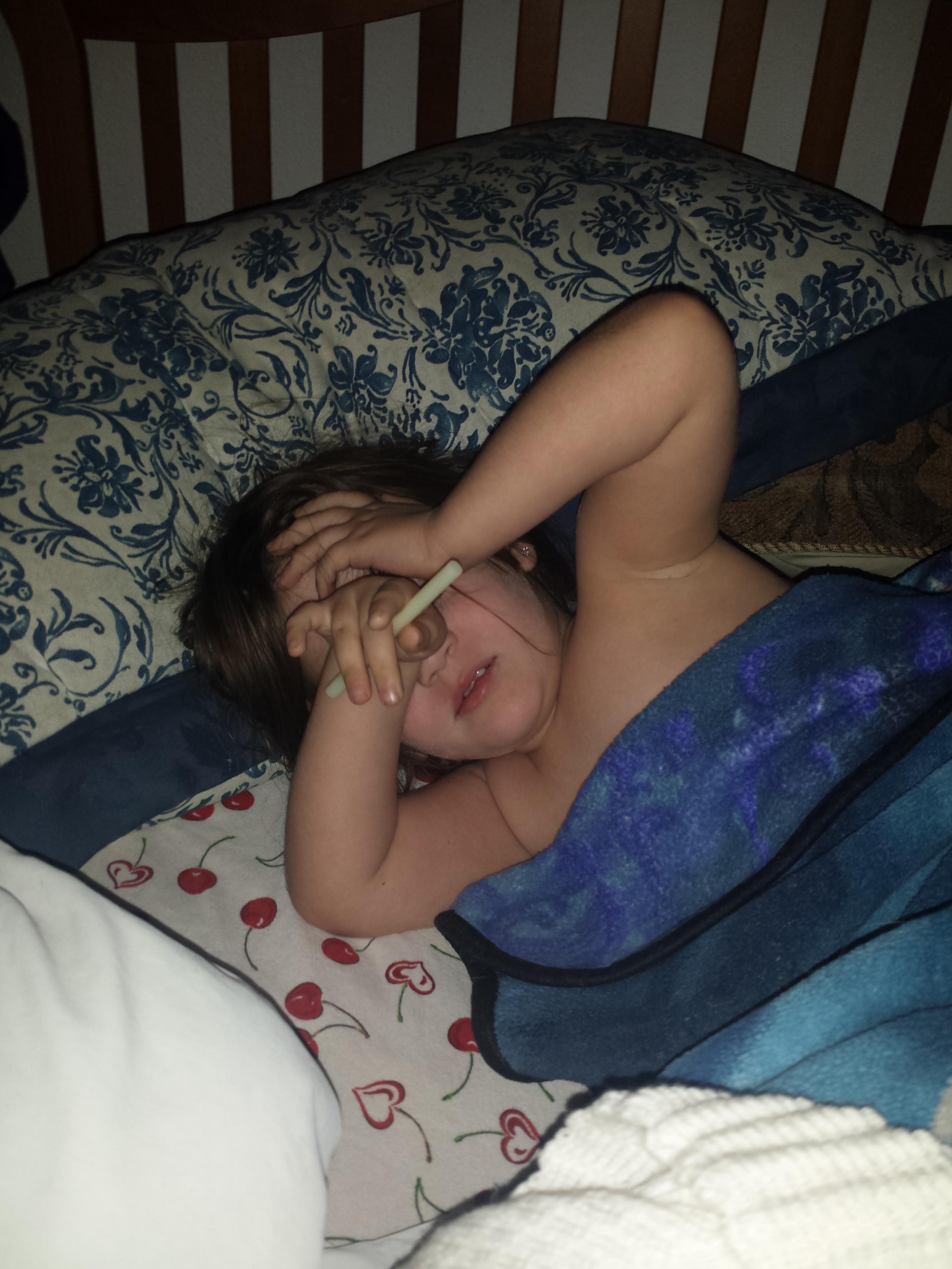 Yau! Still in her bed , and still holding the glow glue stick