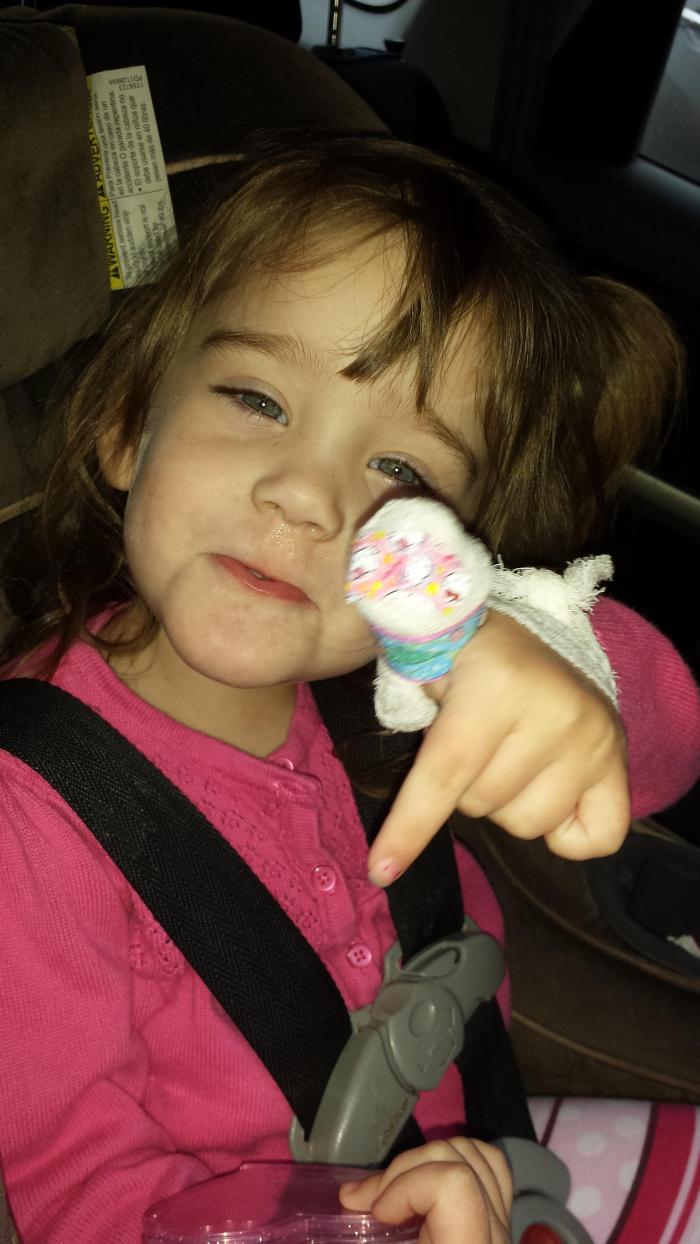 The nail is turning black and it still looks beat up. We wrapped her thumb in gauze then decorated it with band-aids. Darla thinks it looks like a ghost, hence “spooky thumb”.